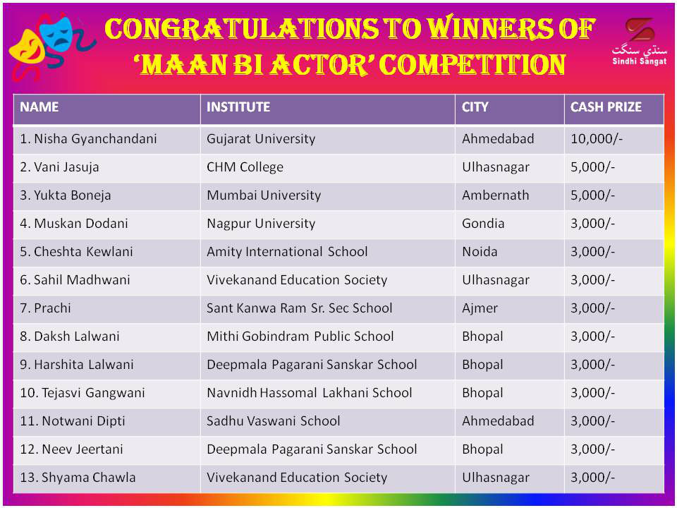 A big thank you to our judges, Gopal Vachhani, Narendra Sadhwani and Heena Thakur for their time and expertise. Cash prizes are awarded by Sindhi Sangat. It is very unfortunate that in spite of giving three months time, we did not get more than a hundred entries. There is not a single entry from Sindhi managed colleges from Bombay. There are three entries from CHM Ulhasnagar.